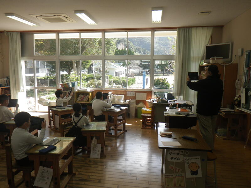 2年生はICT支援員の津末さんに先週、タブレットを使った写真の撮り方を教えてもらいました。