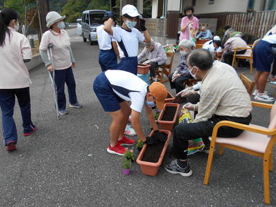 6年生は大江の「みんなの家」に行き、入居者の方と花の苗を植えて交流しました。