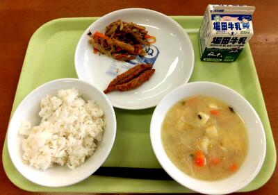 今日の給食のメニューは、白ご飯、こんにゃくきんぴら、田舎汁、きびなごカレーフライです。