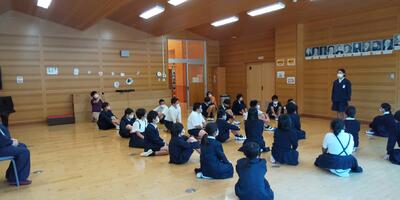 5時間目火災避難訓練がありました。家庭科室から出火したとの想定です。今日は雨のため体育館に避難し、お話を聞いた後、消火訓練をしました。
