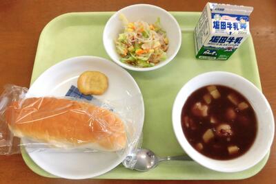 今日の給食のメニューは、ミルクパン、芋入りぜんざい、チキンナゲット、コンニャクサラダです。