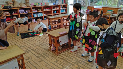 今日はセシリア先生とハローウィンの仮装の衣装を作りました。英語でいろいろな形の名前を習い、色紙を貼り付けながら楽しんで学習することができました。