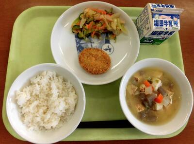 今日の給食のメニューは、麦ご飯、さつま汁、枝豆メンチカツ、ナッツサラダです。