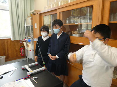 子どもたちの予想では、①振り子の長さ、②おもりの重さ、③ふれはば、が関係している、ということでした。