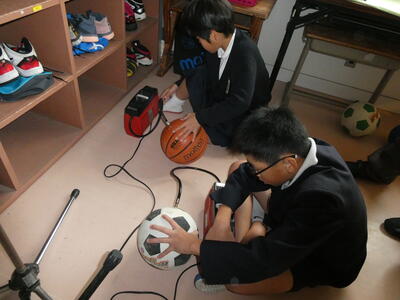体育委員会 ボールの空気入れ 空気が抜けているボールが結構たくさんありました。