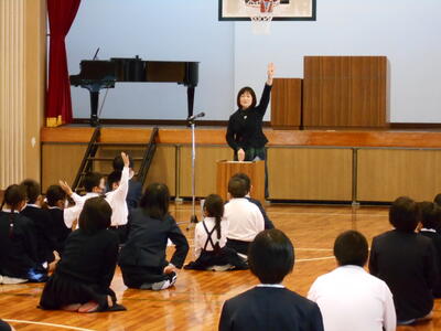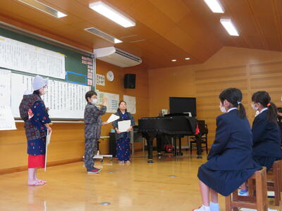 今日は、福連木子守唄保存会の方々をお迎えして、5,6年生が福連木の子守唄についてお話を聞いたり唄を聞かせてもらったりしました。江戸時代、福連木から人吉球磨地方に子守奉公に行った女の子が、子守のつらさや家族と会えない寂しさをうたったのが、福連木の子守唄といわれています。その詳しい背景も教えてもらいました。