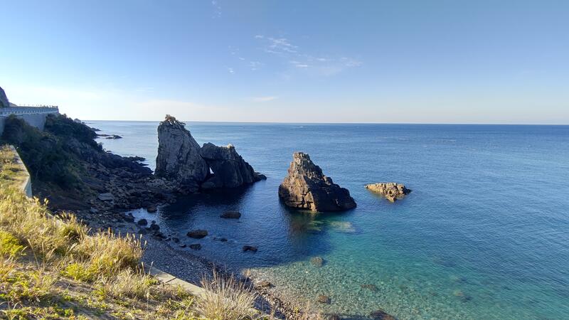 妙見浦に続く道も、今日は晴れて気持ちがよかったです。波も穏やか。下田の海岸は奇岩奇石がいっぱい。