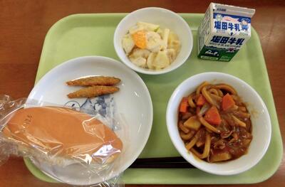 今日の給食のメニューは、コッペパン、カレーうどん、ヨーグルト和え、きびなごフライです。