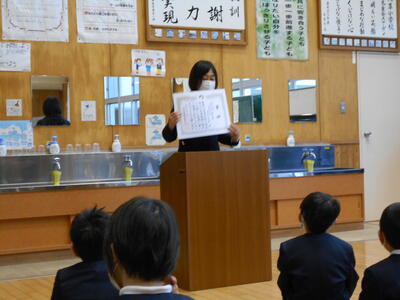 夏休みの絵の作品展や、漢字計算大会満点賞、天草市文化展の表彰がありました。