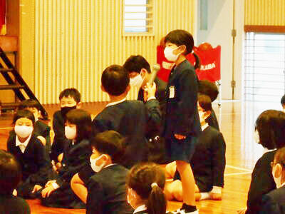 そして、1~3年生が、各委員会に日頃の活動に対するお礼や質問を言いました。委員長はその場で考えて受け応えをしました。1~3年生も上手に話していて、6年生もとても上手に答えていました。感心しました。