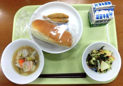 今日の給食のメニューは、麦ごはん、ハンバーグ、けんちん汁、キャベツです。