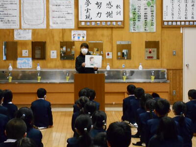 始業式 3学期は勉強も生活も行事も頑張りましょう。姿勢もよくして、体も動かそう。