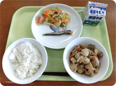 今日の給食のメニューは、麦ご飯・筑前煮・切り干しサラダ・めざしです。
