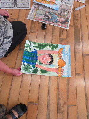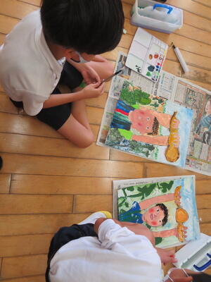 3年生は、れんこん掘り体験を終え、体験したことを絵に表しています。地域学校協働活動推進員でもある下田南の伊野博子先生が、絵の指導をしてくださいました。子どもたちは体験したことを思い返しながら、心に感じたこと、眼に焼き付いていることを、クレパスと,絵の具で表現しました。3年生らしい絵が出来上がりつつあります。