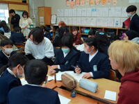 その後、各グループに分かれて、「好きなこと」「今、興味があること」「みんなの学校はどんなところか」「学校のよいところは何か」などについて、大学生に自分たちの言葉で伝えていました。中には、「阿村小はイノシシがよく出ます」と地域ならではのエピソードを話す子もいました。