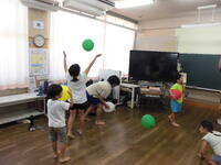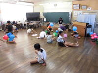まず、クイズ形式で夏休みの過ごし方やおやつの食べ方について考えました。その後、講師の先生に来ていただき、ストレッチや、室内でもできる風船を使った運動を教えていただきました。