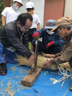 毎年、阿村地区では、秋のお祭りの前の「しめ縄づくり・御幣づくり」を子供たちに見学させてくださいます。