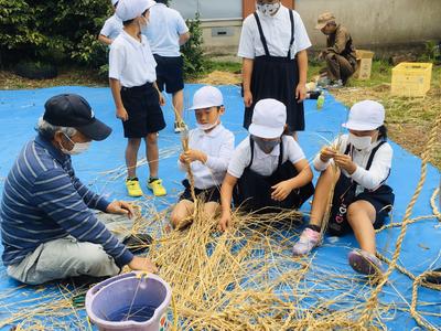 今年は、残念ながらお祭りは、神事・しめ縄づくり・御幣づくりのみになったそうですが、子供たちの見学は変わらずさせていただきました。