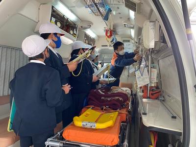 救急車、消防車の、普段は見ることのできない設備も触れさせて頂きました。8月に新しくなった松島分署の建物の中も、見学しました。訓練通報もさせて頂き、通報後どのように連絡があり出動されるのか、見ることができました。