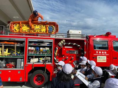 3年生の2学期の社会科は、「働く人と私たちの暮らし」「地域の安全を守る」の学習をします。この日、「店で働く人と仕事」はゆめマート松島店様を、「工場で働く人と仕事」では山下竹輪屋様、「地域の安全を守る」は天草広域連合北消防署松島分署様を見学させて頂きました。