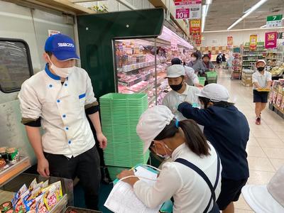 前半は、グループに分かれて店内を自由に見学させて頂きました。お店の中の、商品を売る工夫を写真に収めたり、魚屋さんや、パン屋さん、棚卸しや商品陳列をされている店員さんに質問したりしました。最後は店長さんから詳しい説明もして頂きました。