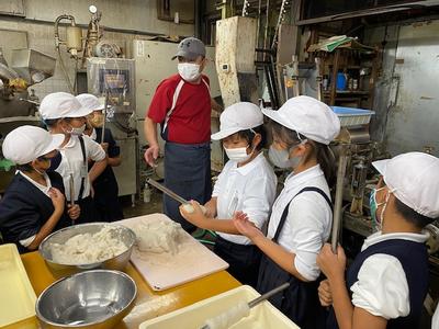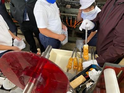 子供たちは創業99年にまずびっくり!でした。初めて見る竹輪製造の機械や、魚をすり身にする機械に目を丸くしていました。「竹輪の穴はどうやって作るんですか。」の質問に、「昔の方法で一緒に作ってみよう。」と竹輪づくりを体験させて頂きました。一人一人自分の竹輪を持たせて頂き、大喜びでした。担任の松田とそ坂本もチャレンジ。その日の夕食に食べました。美味しかったです。