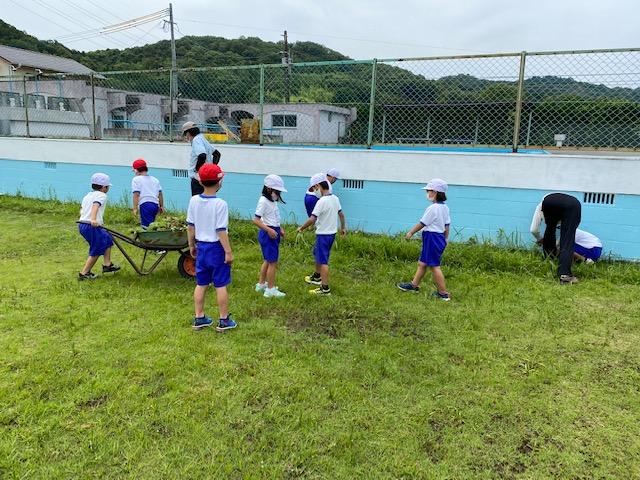 6/7 3校時 1年生と2年生は、プールまわりの背の高くなった草を一生懸命抜いてくれました。45分間で一輪車に4杯分もありました。