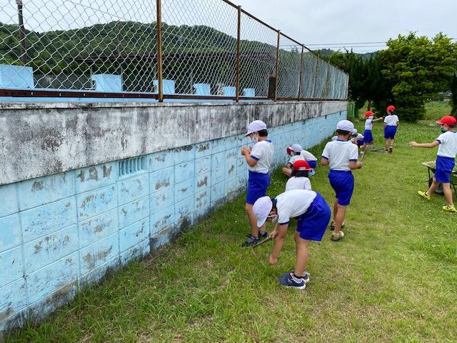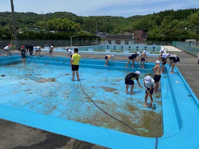 翌日のラジオ体操・朝ランのあと、「みんなでプール掃除を頑張ったこと」「4~6年生は特に頑張ってくれたこと」を話しました。1~3年生は、上級生のお兄さんお姉さんに大きな「ありがとうございます。」を伝えました。少ない児童数ですが、みんなで力を合わせてプールを掃除し、プール開きの日を楽しみに待ちます。