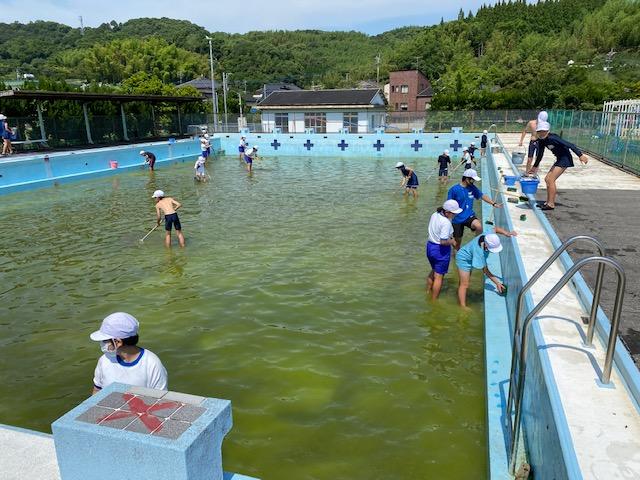 午前中に大プールの掃除が仕上がる予定・・・だったのですが、排水が思うように進まず、時間がかかってしまいました。5,6年生はトータルで3時間プール掃除をしてくれました。4年生は、前日の小プールに続き、更衣室とトイレの掃除をしてくれました。