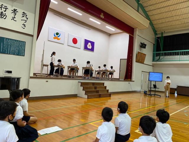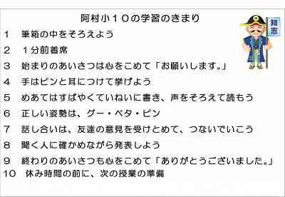 「『阿村小 学習の10ののきまり』を守って知恵いっぱいの阿村小にしましょう。」と6年生が全校児童に呼びかけてくれました。
