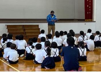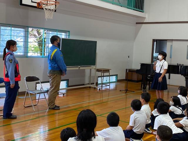 上天草警察署から2名、防犯協会から1名の方にお出でいただきました。低学年等に現れたという設定の不審者役で訓練に参加していただき、児童・教職員それぞれに指導をしていただきました。