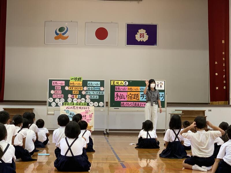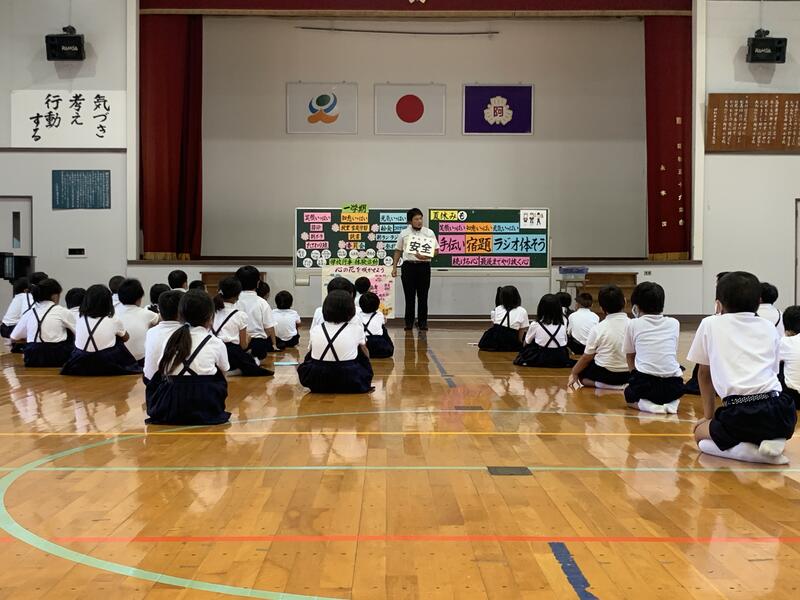 私はグランドデザインに示した教育課程について振り返り、頑張りを誉め、たくさんの花丸をつけました。75人の子どもたちは、本当によく頑張りました。夏休みに頑張ることは「手伝い・宿題・ラジオ体操」育ててほしいと渡した心の種は「続ける心・最後までやり抜く心」の種です。