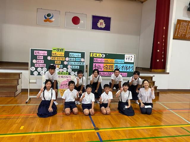 後片付け後の6年生の記念撮影。1学期本当によくがんばってくれた6年生です。ありがとう!夏休みのラジオ体操もよろしく!