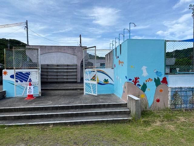 プール入り口の壁画は昨年の6年生による卒業制作です。