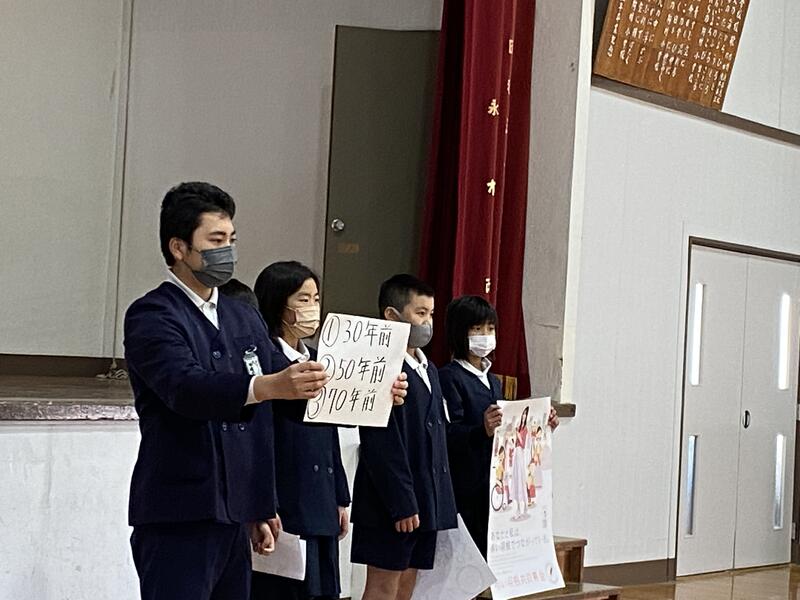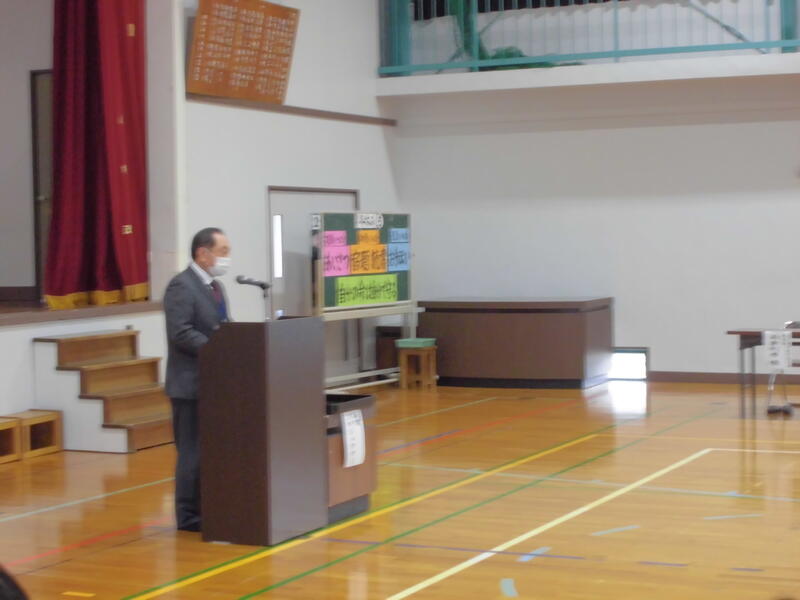 教育長様からは、お祝いのご挨拶をいただきました。ご挨拶の中で出された、ラジオ体操クイズ「初めの運動と、最後の運動の違いはどこでしょう?」に子供たちは大きな声で「手です!」「手のむき!」と答え、「さすが!」と誉めて頂きました。