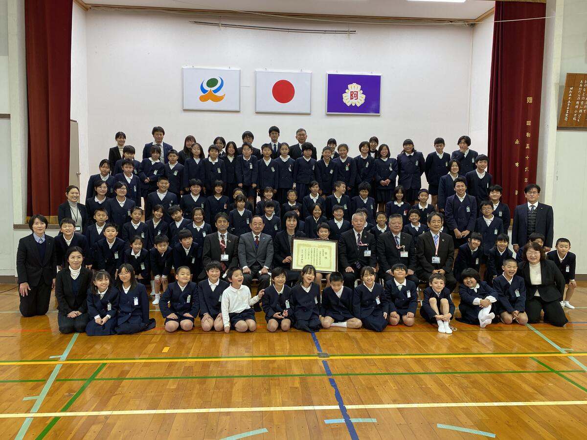 表彰のために、かんぽ生命保険 熊本支店から支店長様はじめ3名、阿村郵便局から局長様が来校されました。