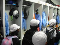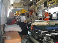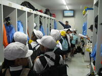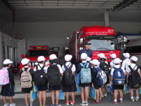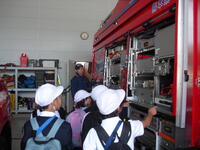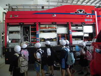 消防署では、救急車の中や消防車の装備品を見せていただき、子どもたちは興味津々の様子でした。短い時間で現場に駆けつけるためのさまざまな工夫にも気付き、働く人の努力に感心していました。