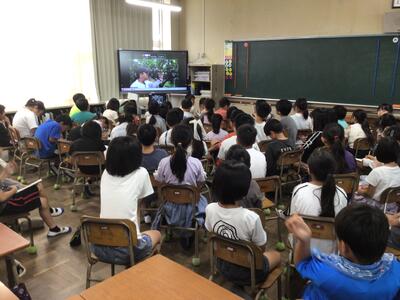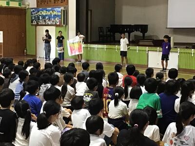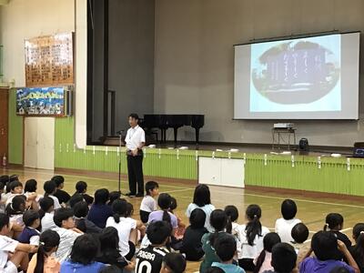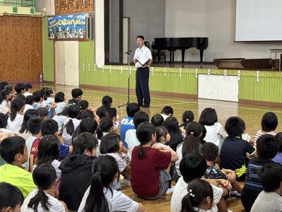 体育館で夏休み前集会を行いました。まずは、校長先生のお話です。入学式や運動会、人権集会などの写真を紹介しながら、4月からの子どもたちの頑張りを振り返りました。また、夏休み前に気をつけて欲しいこととして、「横断歩道の渡り方」「自転車の乗り方」等、事故に気をつけるように、合い言葉として「トマト大作戦」「にらめっ子大作戦」を実行するように話がありました。また、生徒指導、保健指導担当より夏休みの過ごし方について話をしました。