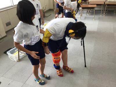 4年生は総合的な学習の時間に[福祉]について学習しています。今回は高齢者疑似体験をしました。重りをつけたりゴーグルをかけたりして、体の動きにくさや見えにくさを体験しました。高齢者の不自由な状況に気づき、優しい気持ちをもつことの大切さを学びました。