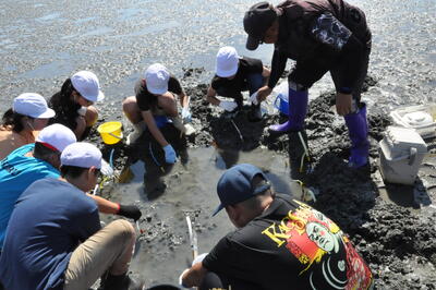 5年生は環境学習の一環で、荒尾干潟にまじゃく釣りに行きました。11名の名人さんが釜立てをしてくださり、筆を使ってのまじゃくの釣り方を丁寧に教えてくださいました。穴に筆を入れると、まじゃくが筆を押し上げていく様子に、子どもたちは歓声をあげていました。名人さんのご厚意により、たくさんのまじゃくをお土産として持って帰ることができ、みんな大喜びでした。
