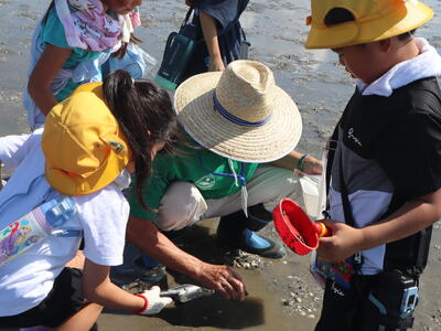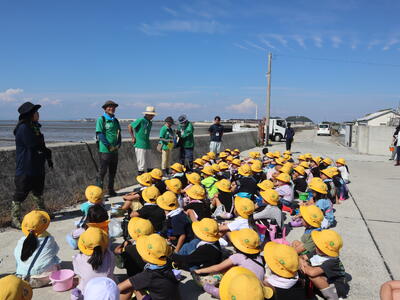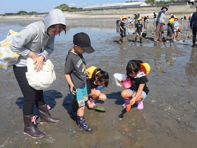 1年生が磯遊びで打越海岸に行きました。初めて干潟を歩く子どもたちが多く、また、カニなどの生き物を捕まえ、ワクワクの磯遊びとなりました。子どもたちが安全に活動できるために、多くの保護者の方のご協力がありました。大変ありがとうございました。