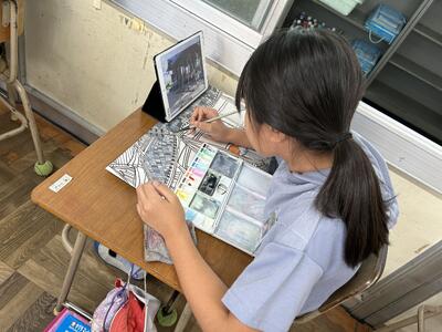 5年生は熊野座神社の写生をしています。それぞれタブレットで撮った写真を見ながら、上手に着色しています。