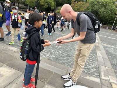 また、観光に来られていた外国人の方に、自分たちの作った荒尾のパンフレットを配りました。