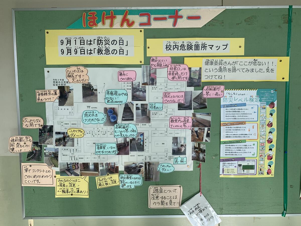 ★学校の掲示板に、健康委員さんが調べてくれた、校内危険箇所マップが掲示してあります。