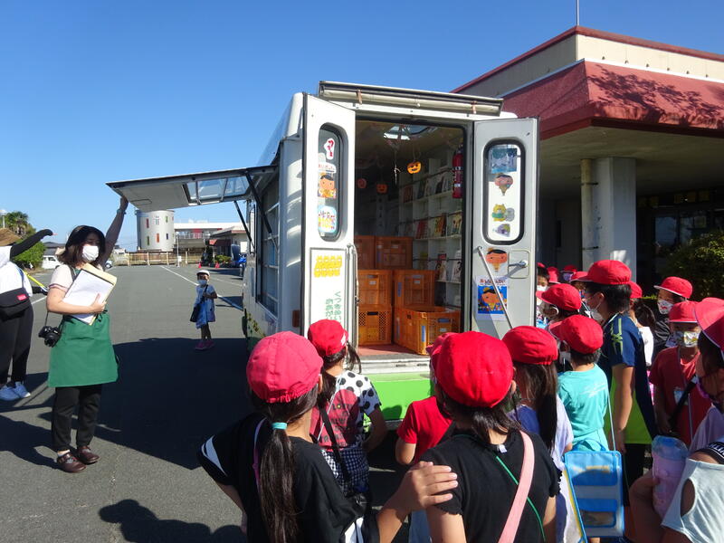 「読む読むくん号」です。遠くに住んでいる人も借りられるように、移動式の図書館になっています。