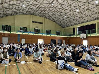 就任式及び始業式を行いました。今年度転入してきた職員は9名です。子どもたちは興味津々で話を聞いていました。