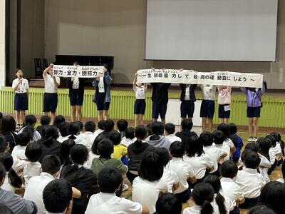 児童集会で運動会のスローガン発表がありました。今年度のスローガンは「努力・全力・団結力」~一生懸命協力して 最高の運動会にしよう~です。このテーマに込められた思いをプロジェクト委員会が分かりやすく伝えました。