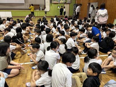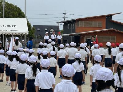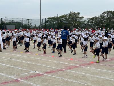 運動会の全体練習が始まりました。第1回目は主に開会式の練習です。まずは入場行進です。列をそろえながら歩くのが難しかったですが、周りの子を意識しながら上手に出来ていました。