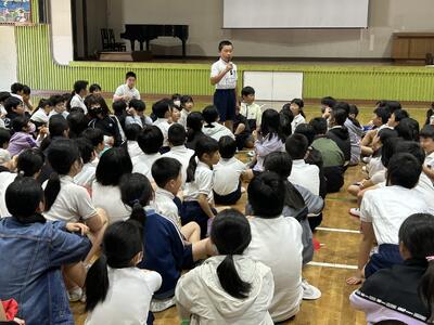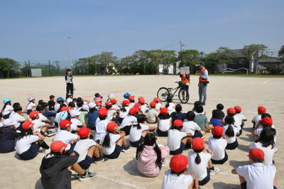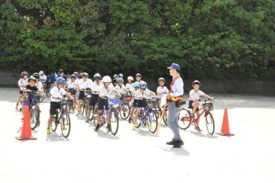 3年生から6年生までの交通教室を行いました。荒尾市役所防災安全課の方を講師に招き、自転車の点検の仕方や安全な乗り方などを指導していただきました。