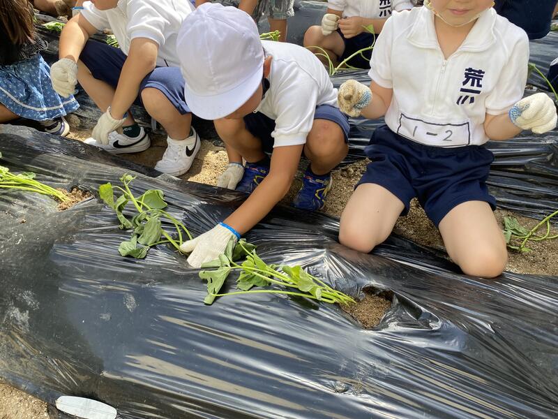 去年までいらっしゃった畑のスペシャリスト、波瀬山先生をゲストティーチャーにお迎えして、いもの苗植えをしました。